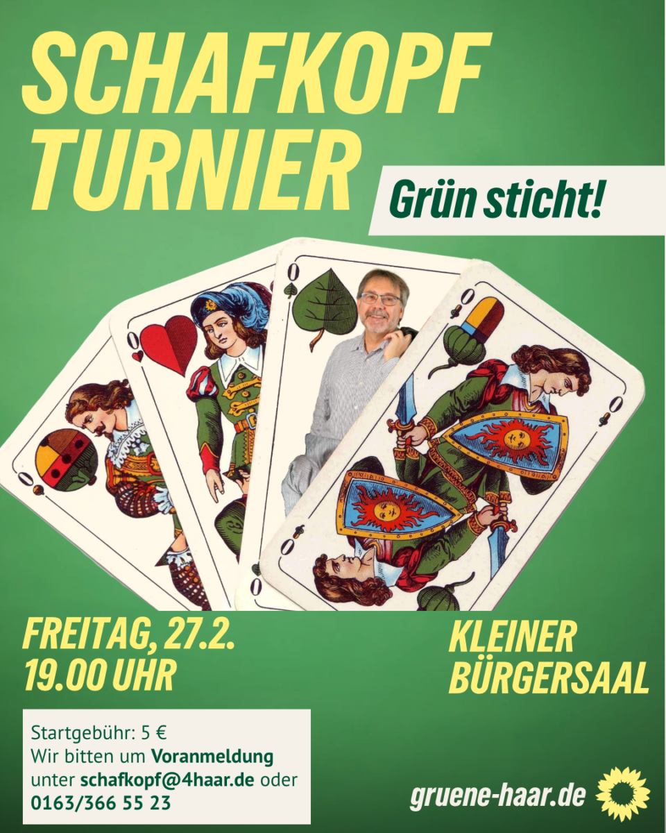 Wir laden alle Kartlerinnen und Kartler ein zum ersten grünen Schafkopfturnier! Wir bitten um Voranmeldung unter schafkopf [at] 4haar [dot] de oder Telefon 0163/366 55 23