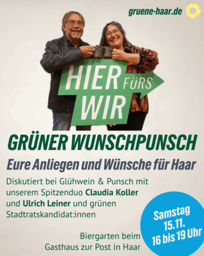 Diskutiert bei Glühwein & Punsch mit unserem Spitzenduo Claudia Koller und Ulrich Leiner und grünen Stadtratskandidat:innen.