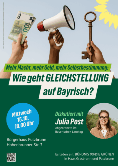 Gleiche Chancen entstehen nicht von allein – wir machen sie vor Ort sichtbar. Gemeinsam mit Julia Post, MdL (Sprecherin der Grünen-Landtagsfraktion für Frauen, Jugend und den Öffentlichen Dienst) und weiteren Gästen fragen wir: Wie wird Gleichstellung in Bayern ganz konkret? Etwa in Kinderbetreuung, Personalpolitik, Bürgerbeteiligung oder Vereinen.